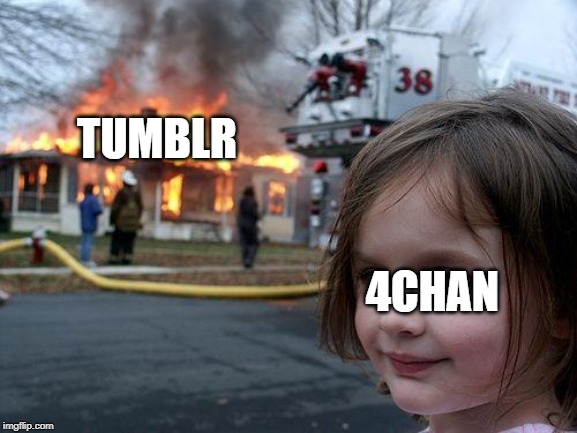 On july 4th 2014 a great war began. between tumblr and 4chan, tumblr made the first strike posting feminist memes, puppies and selfies were spread all over the website to try and defeat these “fascists” but 4 chans defences were to strong having won many wars through the years. the counter strike 4chan caused was so powerful that it caused the vast majority of tumblr users to hop of the website for days and those who stayed were hopeless against the porn, racist and anti feminist memes sand gore posted on the popular tags.